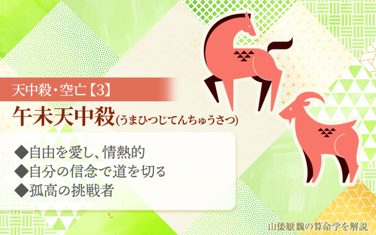 午未天中殺(空亡)とは? 午未天中殺とは「うまひつじてんちゅうさつ」と読む天中殺の1つです。 このグループに属する人は、自らが物事を終結させる役割を担う存在とされ、「子ども」「部下」「後輩」といった自分より年下や立場が下 … 続きを読む 午未天中殺・空亡とは何か?期間や気をつけることと性格/仕事/恋愛/相性